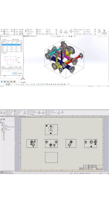 MDTools 970 可以检查液压集成块的壁厚、设计错误,以及设计中遗漏和不合格的联接。三维液压集成块的装配体可以在半自动形式下创建,液压阀件可以与对应的孔位自动关联。同时,MDTools 970 可以自动为您创建一个专业的工程图,包括尺寸标注、孔加工编码、镗孔交叉列表、堵塞以及标记图表等